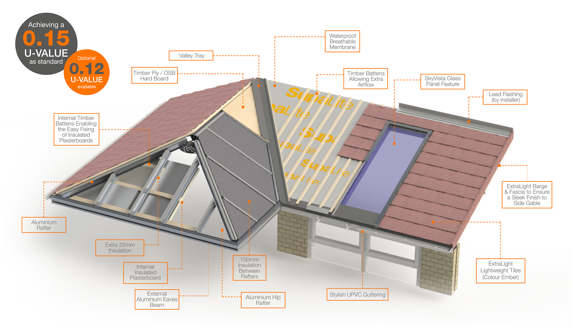 The SupaLite roof uses a lightweight, aluminium frame, 185mm of rigid insulation, a waterproof membrane and sturdy tiles to create a resilient conservatory that can withstand any weather! Our roof system has undergone testing to ensure the roof is compliant with UK building Regulations.